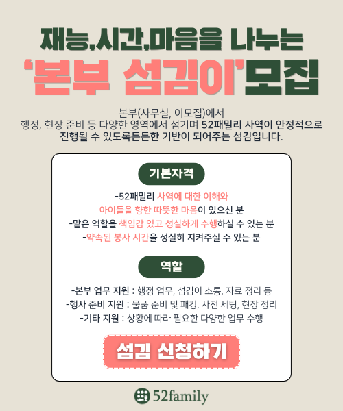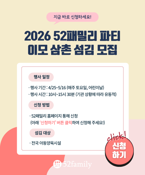 ‘우리가 아이들의 엄마가 되어 줄 수는 없어도 이모는 되어 줄 수 있잖아요’ 아이들에게는 일대일의 사랑을 전할 수 있는 관계가 매우 중요합니다. 52패밀리는 ‘더해진 가족'을 통하여 아이들의 정서적 이모, 삼촌이 되어 평생 가족의 관계를 맺어갑니다.