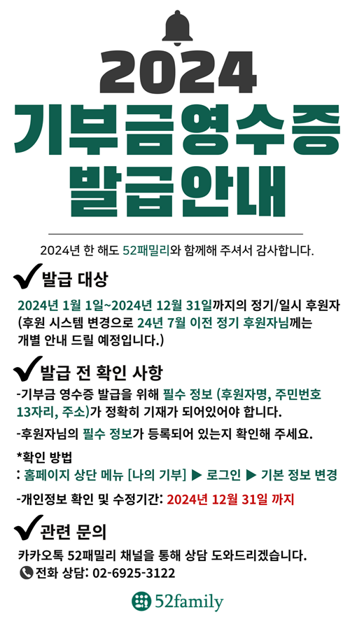 2. 후원 계좌로 직접 기부하신 경우: 52패밀리 카카오톡 채널을 통해 기부금영수증 발급신청