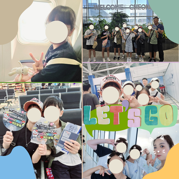 선생님의 손을 잡고 비행기를 타기 전 설레는 마음을 감출 수 없는 아이들의 모습입니다.