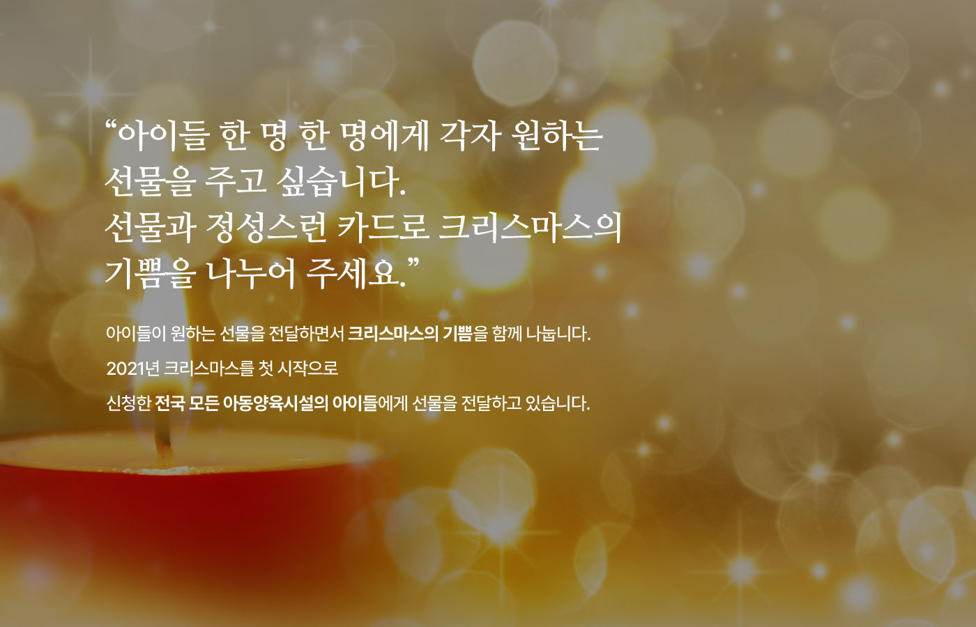 · 가능한 경우 선물 전달 이벤트를 함께 진행함으로써 아이들에게 소중한 크리스마스 추억을 선물합니다.